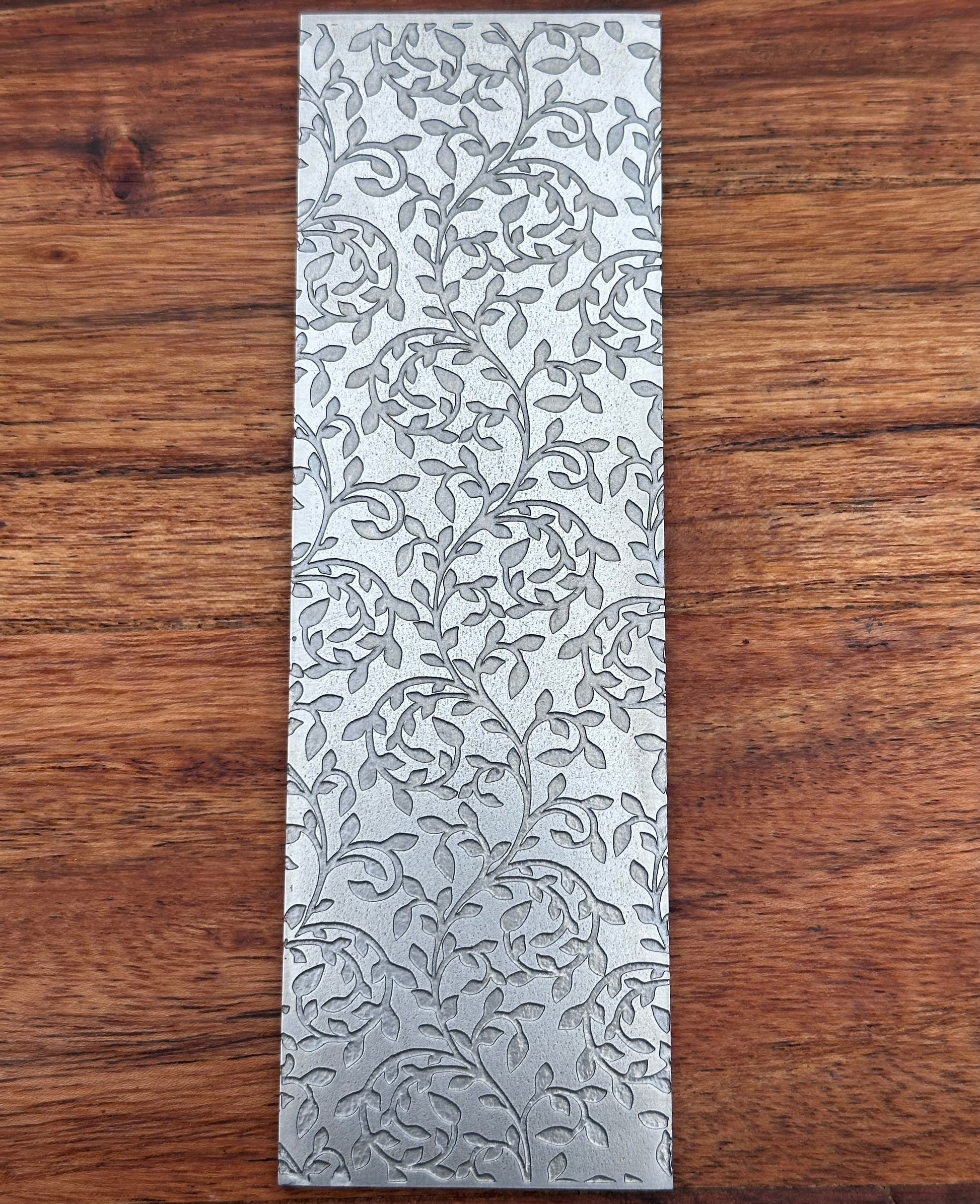 Each plate made from cold rolled mild steel and hand etched pattern. Can be used with a rolling mill, hydraulic press or hand hammering(a protective lead sheet need to be used for hammering by hand, and a urethane piece will works better with the hydraulic press).
